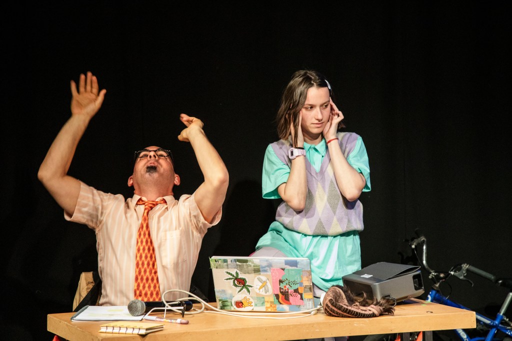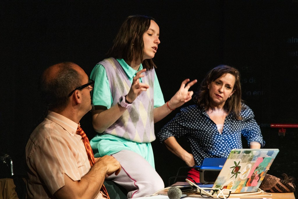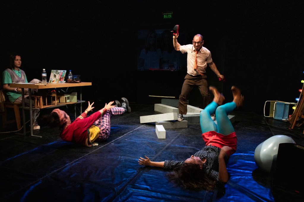 Por otro lado, después, empecé a escribir sobre esa maestra con la amiga que bailan flamenco y en un momento empecé a probar algunos textos con la «IA» inteligencia artificial a pedirle que me escribiera y bueno me pareció bastante alucinante. Por otro lado me asustó muchísimo porque dije «bueno ¿qué se hace con esto?». Entonces le empecé a dar vueltas, a pensar cómo se usaría, cómo entraría esto en escena; me empezó a instalar un montón de pensamientos, de reflexiones. También sobre cómo funciona el cerebro hoy en día, cómo en este contexto de tanto dispositivo, la mente empieza a funcionar de otras maneras.
