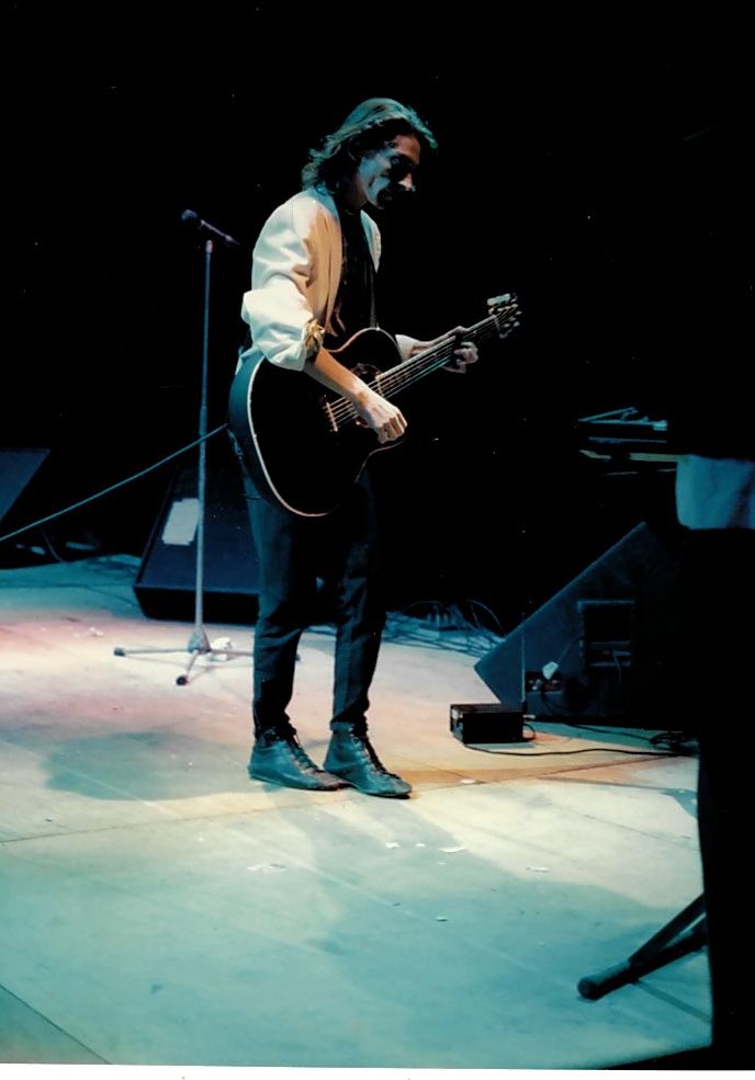 Más allá de esa foto y su emotividad, Damián revela que hay otra foto – también en el libro – en la que Federico está con una guitarra esta vez sobre el escenario de un Virus recontra exitoso en la época de «Imágenes paganas» con la guitarra y tiene como el mismo gesto en la cara.