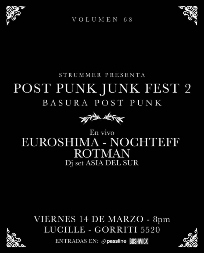 La segunda edición del Basura Post Punk Fest, organizado por Sergio Rotman y Strummer Bar llega este 14 de marzo. Esta vez contará con las presencias del ex Mueran Humanos y Dios Nochteff; Tomás Nochteff; y el regreso de la banda post punk de los ’80, Euroshima, más el mismísimo Rotman y su banda. Con la musicalización de Asia del Sur.