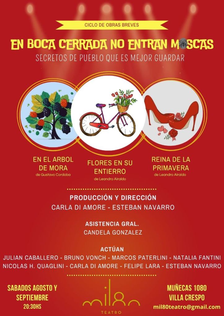 Un secreto a punto de revelarse, un amor imposible y tres comedias con tintes dramáticos que nos trasladan a distintos pueblos cargados de humor, miserias y emociones. Así se presenta En boca cerrada no entran moscas, el ciclo de obras cortas con autoría de Leandro Airaldo y Gustavo Córdoba, e idea y dirección compartida por Carla Di Amore y Esteban Navarro (Tban).