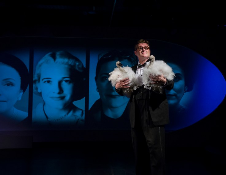 Lo bueno de este tipo de trabajo que hicimos con Gabriel -como también se dio con el resto de los artistas- como también es el caso de Cristóbal, que es músico y no es actor, sin embargo actuó y tocó acordeón en escena. Yo trabajo como si fuera una sastre, una costurera, diseño la obra en función de los cuerpos actuantes, entonces son «trajes a medida» los que podemos hacer cuando tenemos esta posibilidad de gestar un texto dramatico desde el inicio. Y como también es la historia de Gabi, eso ya estaba puesto sobre su cuerpo, esos textos son propios sobre su vida, y mi trabajo como directora y dramaturga fue acompañar y estructurar la dramaturgia, pero la verdad es que el soporte de esos texto es lo que él le dió a la obra. Entonces, para mi es muy fácil escribir desde ese lugar y acompañar desde la dirección, más allá de que es un actor ductil y que cuando pasa a ser Capote es muy grande, y a él le queda comódo el personaje y lo entrenó un montón, pasó por un coach vocal y tomó clases de danza con Vivian Luz. Se preparó un montón para hacerlo, esta dentro de su registro. Entonces es un proceso en el cual el llega bien, llega cómodo y para eso es algo importante porque para mí Gabriel es un actor al que le faltaba oficio en este espacio, entonces, es fantastico lo que logra y el oficio claro con cada función en donde lo va ganando.