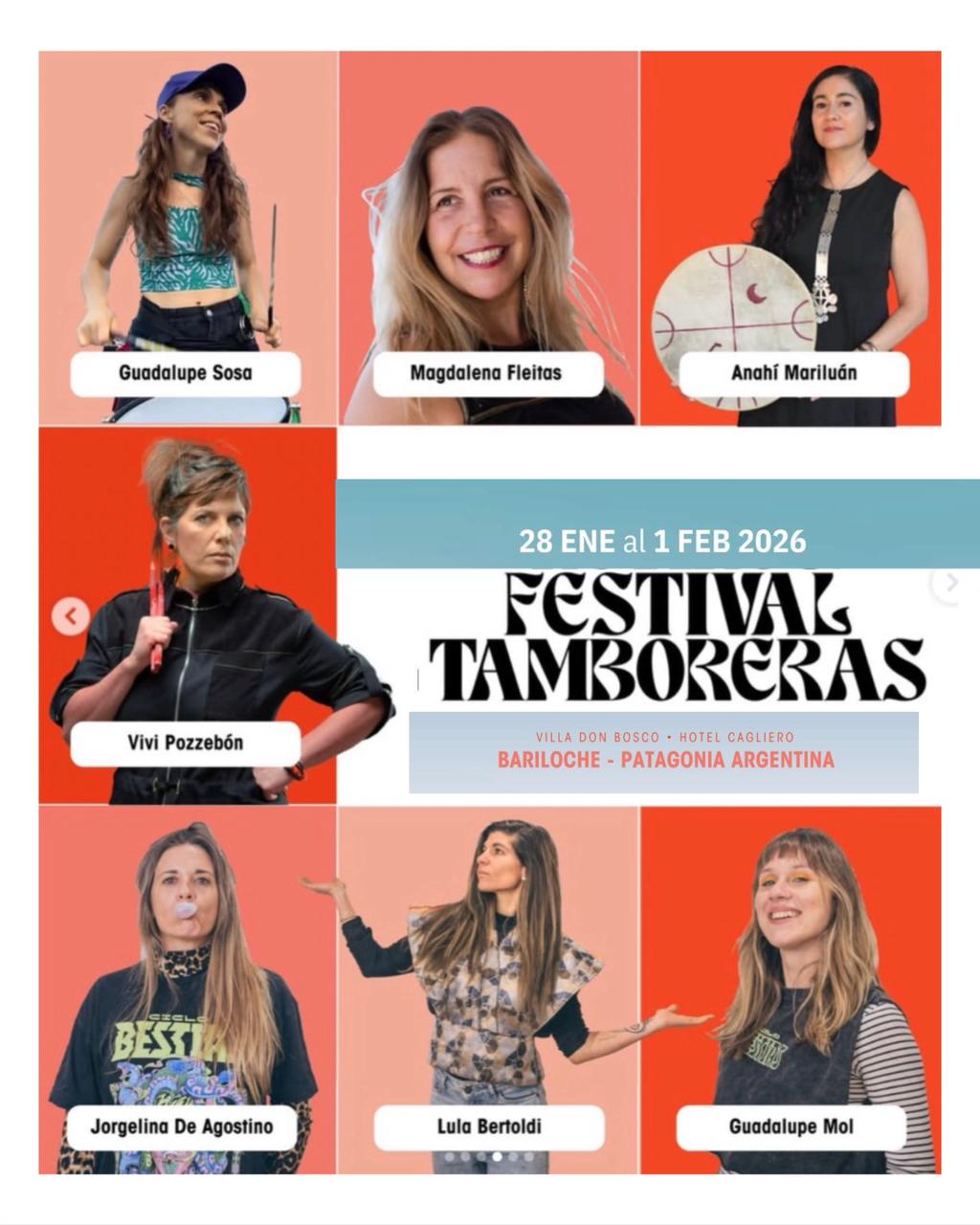 Como cada año, estarán nuestras queridas anfitrionas locales: Anahí Rayén Mariluán, con su canto y música mapuche; Guadalupe Sosa, directora de la Escuela de Percusión por Señas La Nube Percusión; y quien les habla, Vivi Pozzebón, directora de la Escuela de Tamboreras. Además, se sumarán más artistas locales y DJs que iremos confirmando.